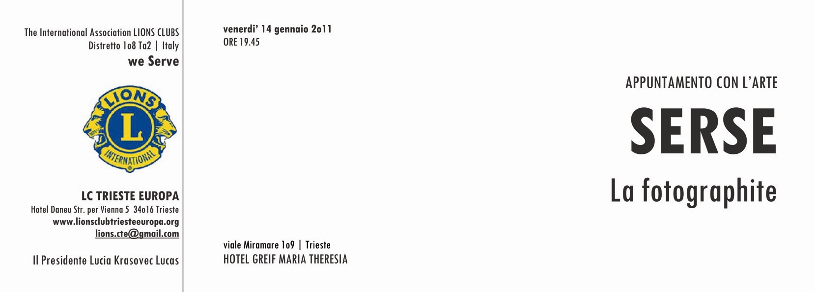 Written by Lions Club Trieste Europa10 gennaio 20111 marzo 2011 Appuntamento con l’arte SERSE: La fotographite venerdì 14 gennaio 2011 Hotel Greif Maria Theresia – Viale Miramare 109, Trieste Condividi: Invia un link a un amico via e-mail (Si apre in una nuova finestra) E-mail Condividi su Facebook (Si apre in una nuova finestra) Facebook Mi piace Caricamento...