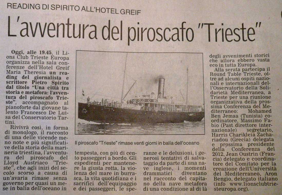 Il giornalista e scrittore Pietro Spirito ci parla della sua città: una Trieste tra storia e metafora e dell’avventura del piroscafo del Lloyd Austriaco “Trieste”. Lo accompagna al pianoforte, nel corso del reading, Francesco De Luisa del Conservatorio Tartini.