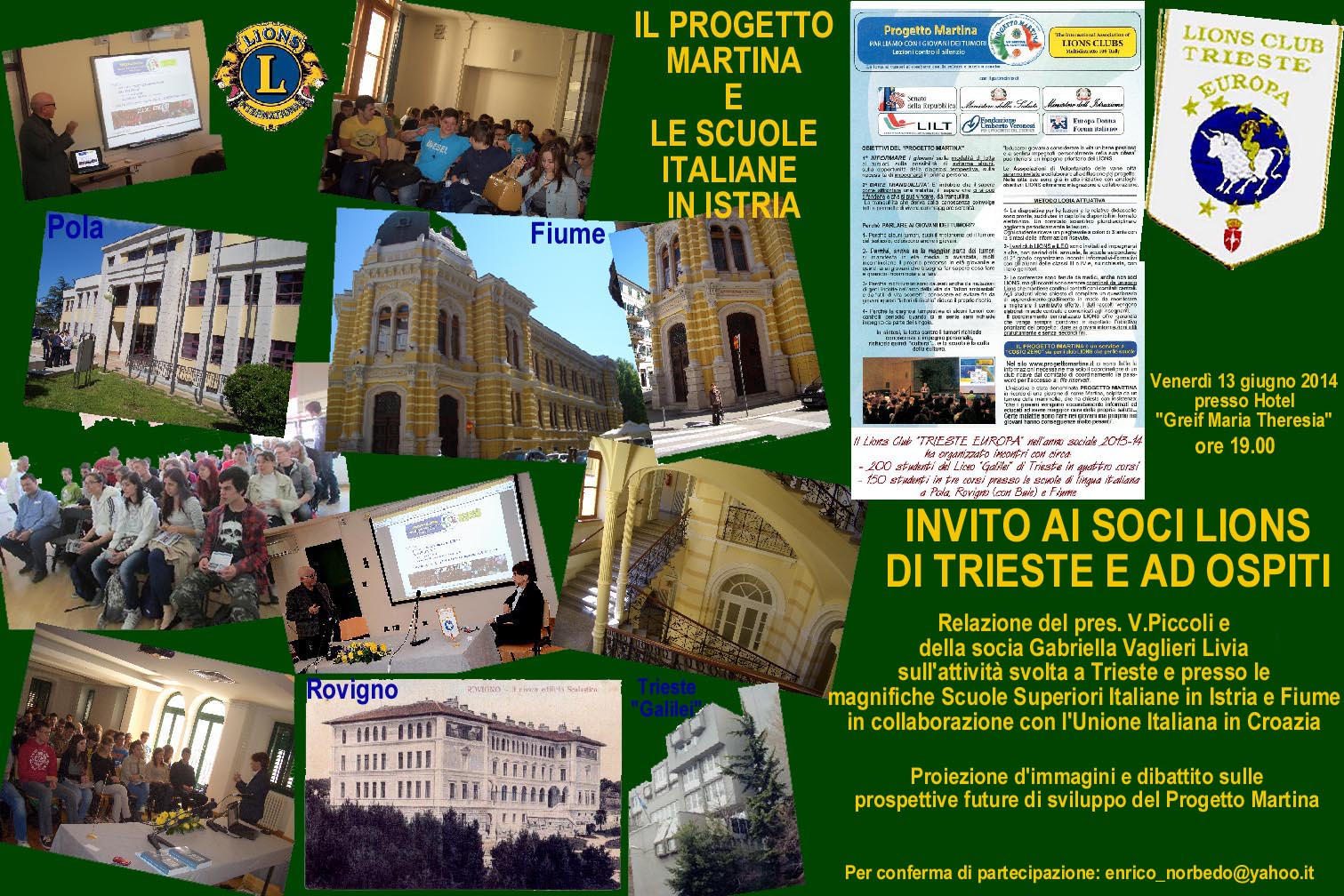 Venerdì 13 giugno, alle ore 19.00, presso l’Hotel Greif Maria Theresia, relazionano sugli esiti del progetto, portato avanti in collaborazione con l’Unione italiana in Croazia, il presidente Vittorio Piccoli e la socia Gabriella Vaglieri Livia.
